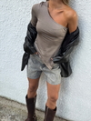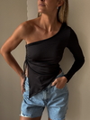Top modal un hombro manga larga, con frunce lateral y terminación irregular.